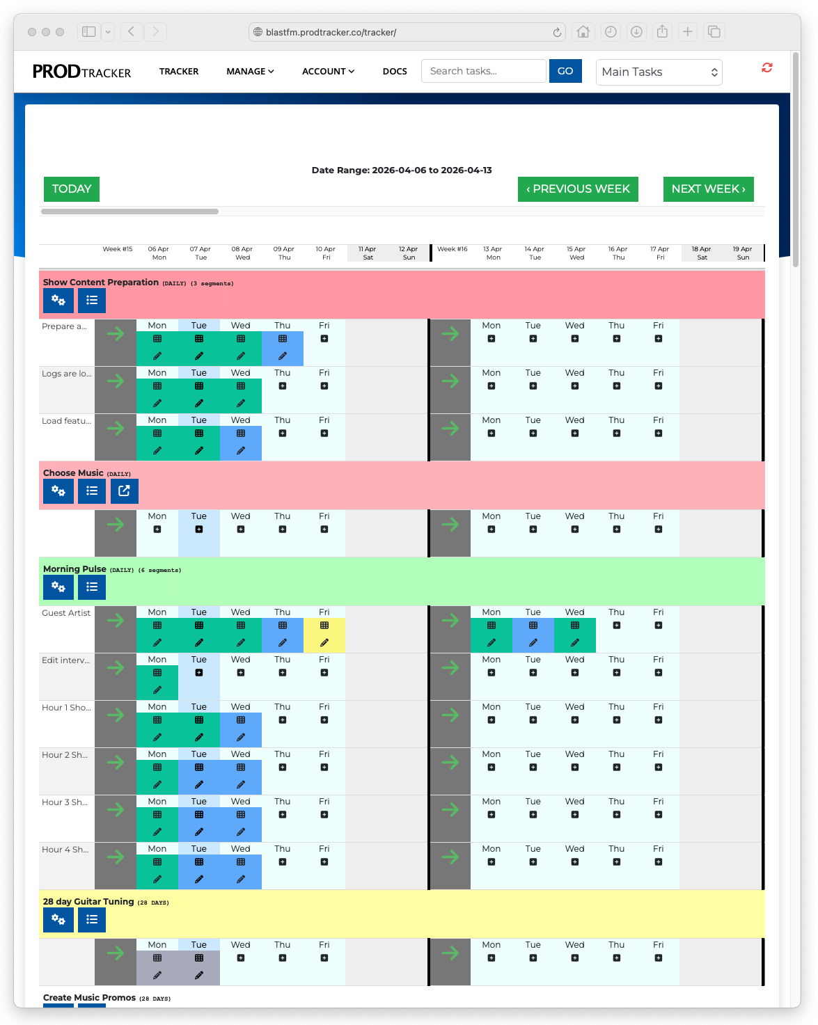 ProdTracker grew out of years of radio production — a world of daily deadlines, recurring checklists, and teams spread across shifts and locations. It was built to solve a specific problem: recurring task management where the same work repeats, week after week.