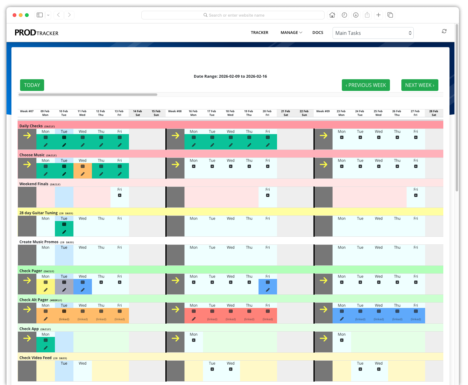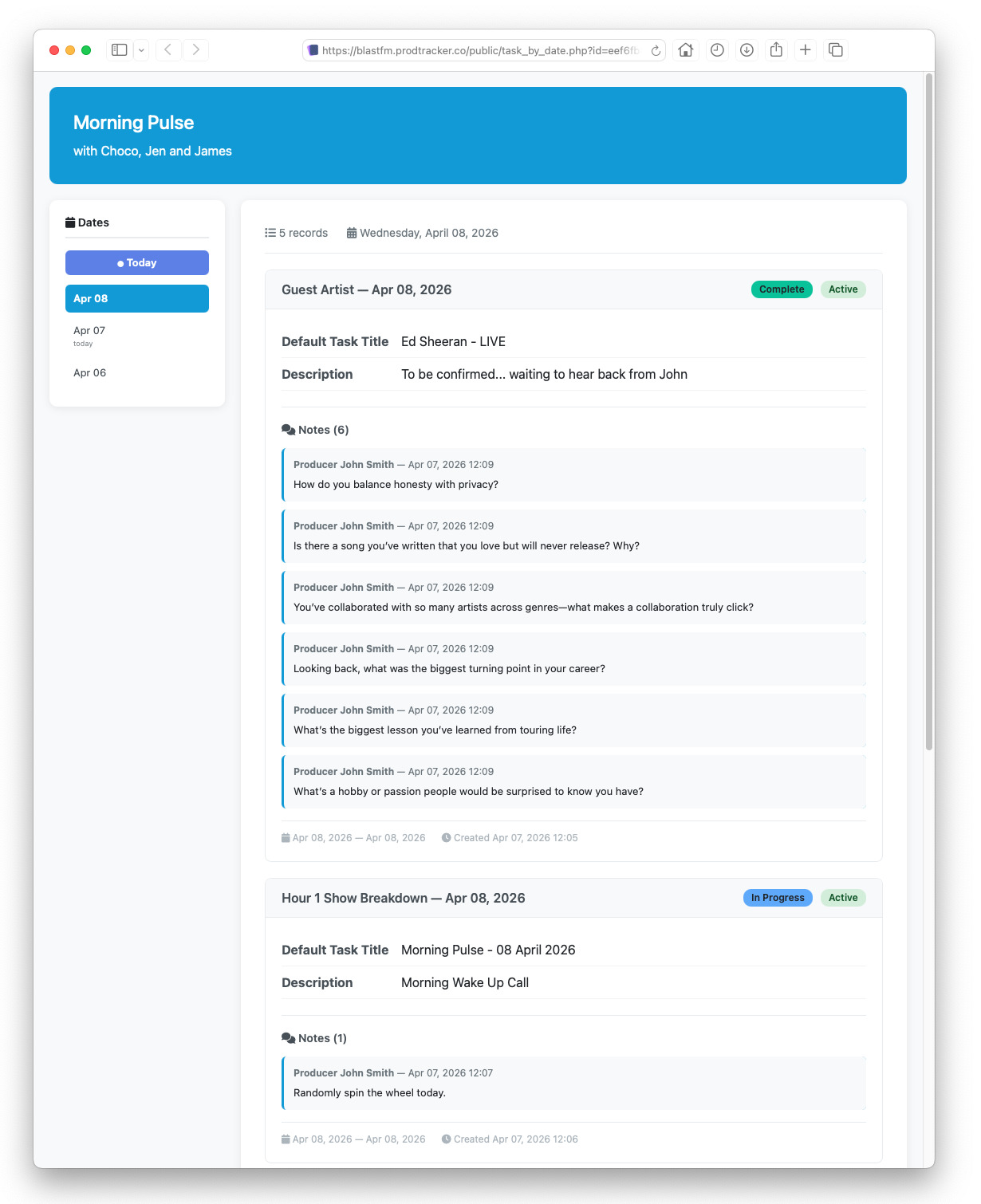 ProdTracker grew out of years of radio production — a world of daily deadlines, recurring checklists, and teams spread across shifts and locations. It was built to solve a specific problem: recurring task management where the same work repeats, week after week.